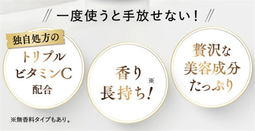 ニオイや黒ずみケア、使いやすさ、そしてトリプルビタミンC配合の美容成分について説明します。