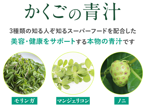 かくごの青汁の主成分は、モリンガ、ノニ、マンジェリコンの3種類のスーパーフードです。