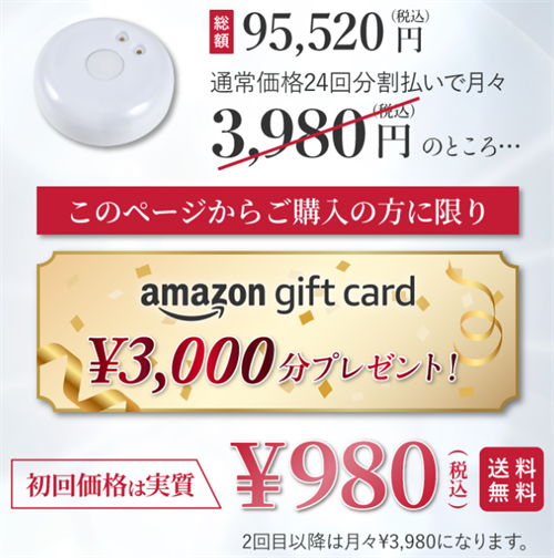 現在の特別キャンペーンでは、通常価格95,520円(税込)のMaskin Careを、分割払いで月々3,980円(税込)の支払いプランで購入できます。