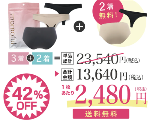 3枚セットで購入すると、さらにお得に2枚無料プレゼントが付き、合計5枚のショーツが手に入ります。