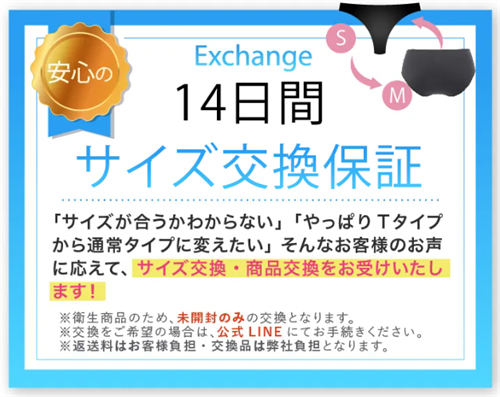 購入後にサイズが合わなかった場合や、Tバックタイプから通常タイプへの変更を希望する場合でも、安心の14日間サイズ交換保証があります。