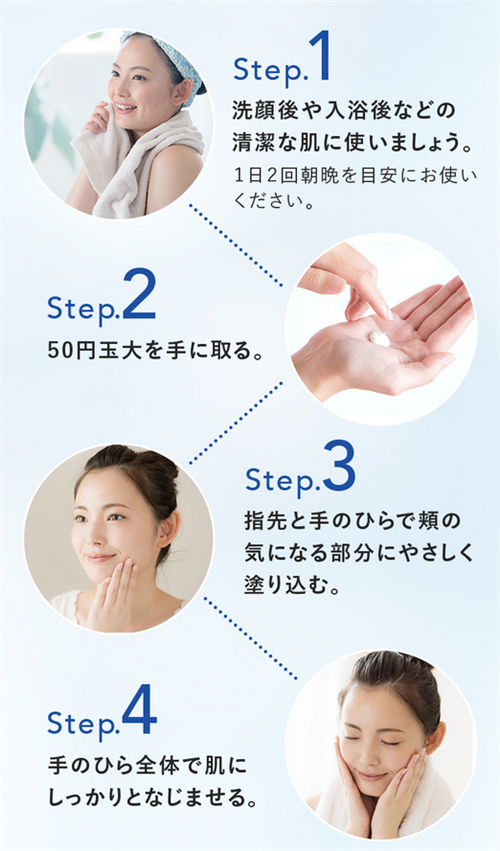 A:朝晩のスキンケアの最後に、適量(500円玉大)を手に取り、気になる部分にやさしくなじませます。